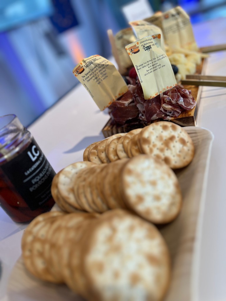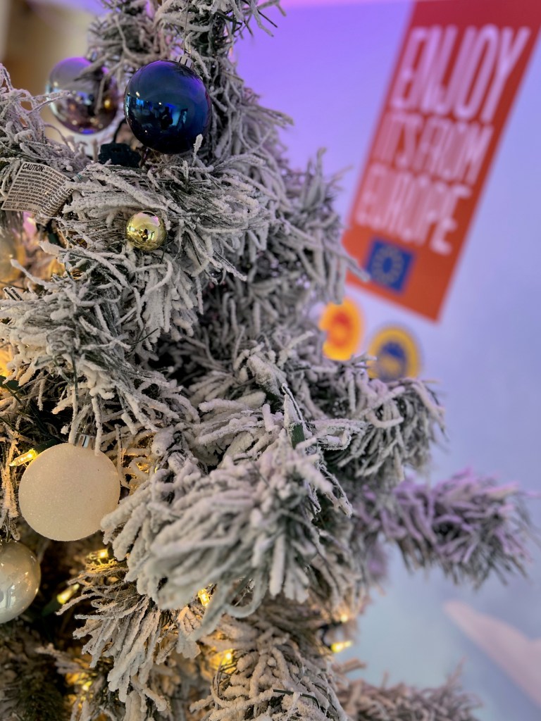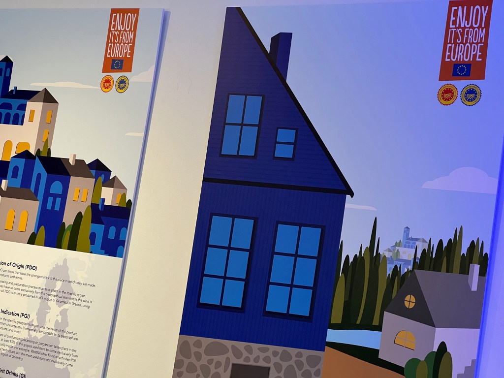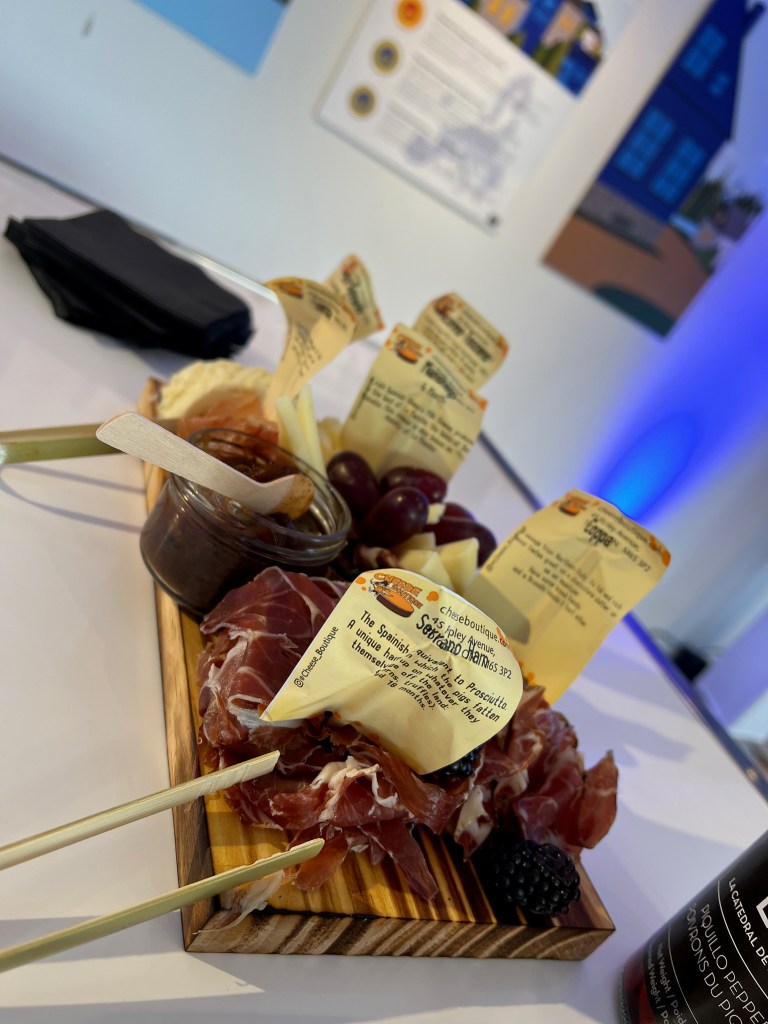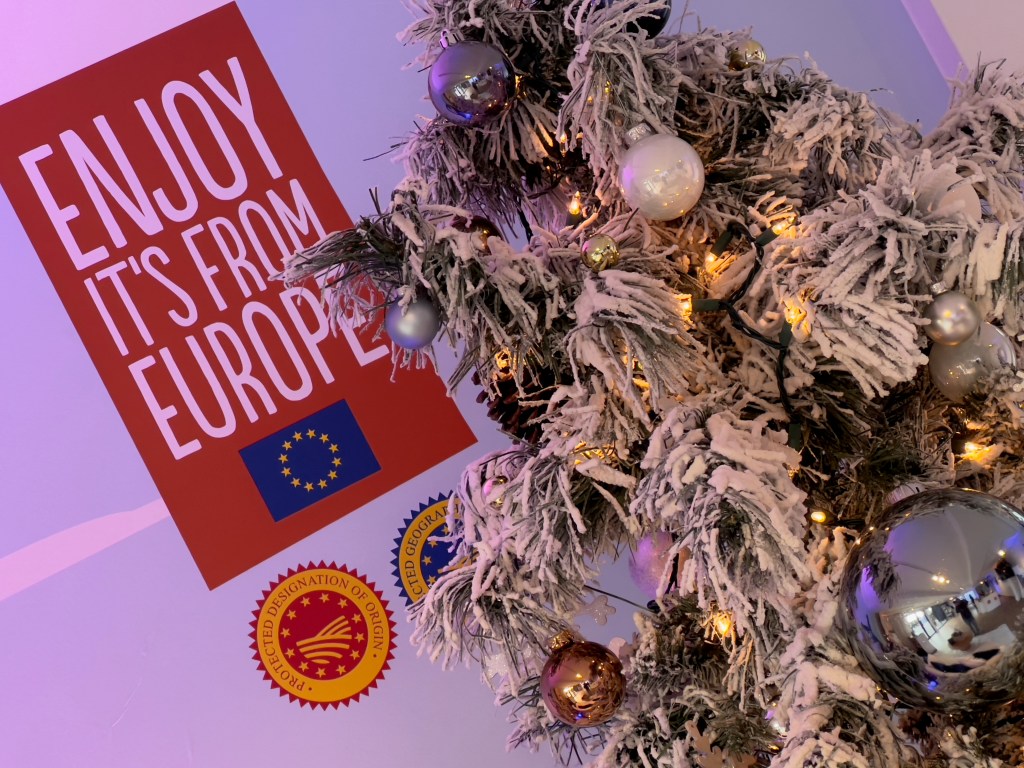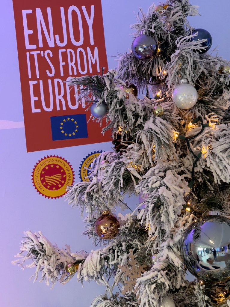 Enjoy! Excellent European products are showcased at this pop-up at Stackt Market during December, 2023. High quality products such as wine, cheese, liquors, and much more are displayed, with the seal of the EU, denoting its supreme quality and strict quality control. Charcuterie with top cheeses and cured meats provided by the best and most artful cheese purveyor in Toronto, the Cheese Boutique, is available to the fortunate who make it this December to the unique container-based market just west of downtown Toronto.