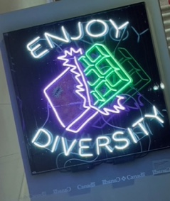The “Enjoy Diversity” neon sign in the window of the Arthur Erickson-designed Canadian Embassy was a welcome sign to see while strolling through the streets of Washington DC.